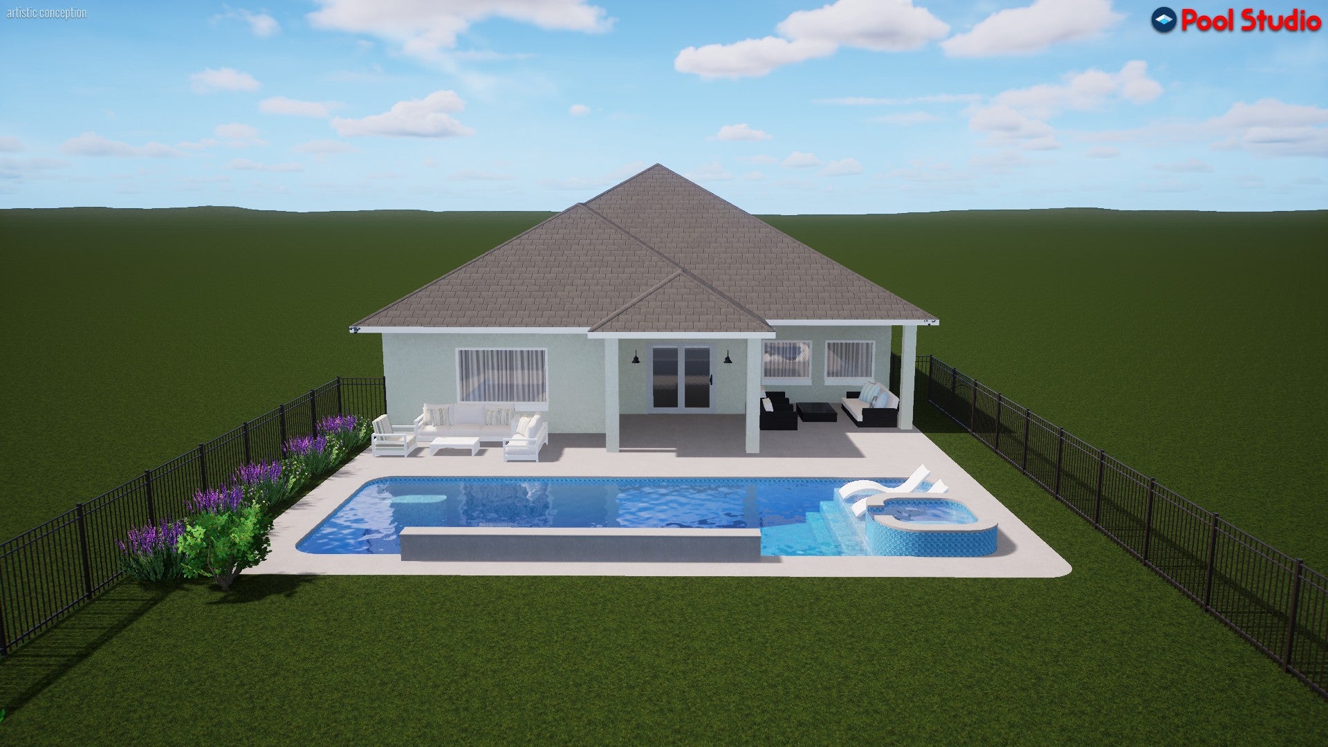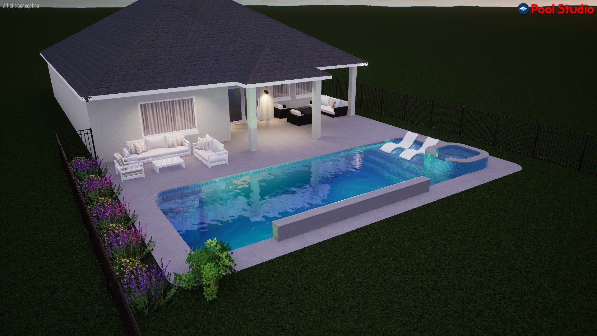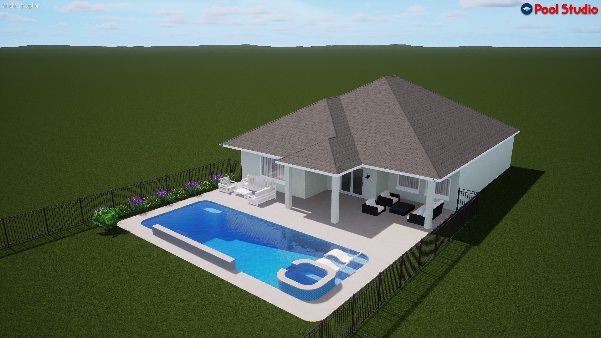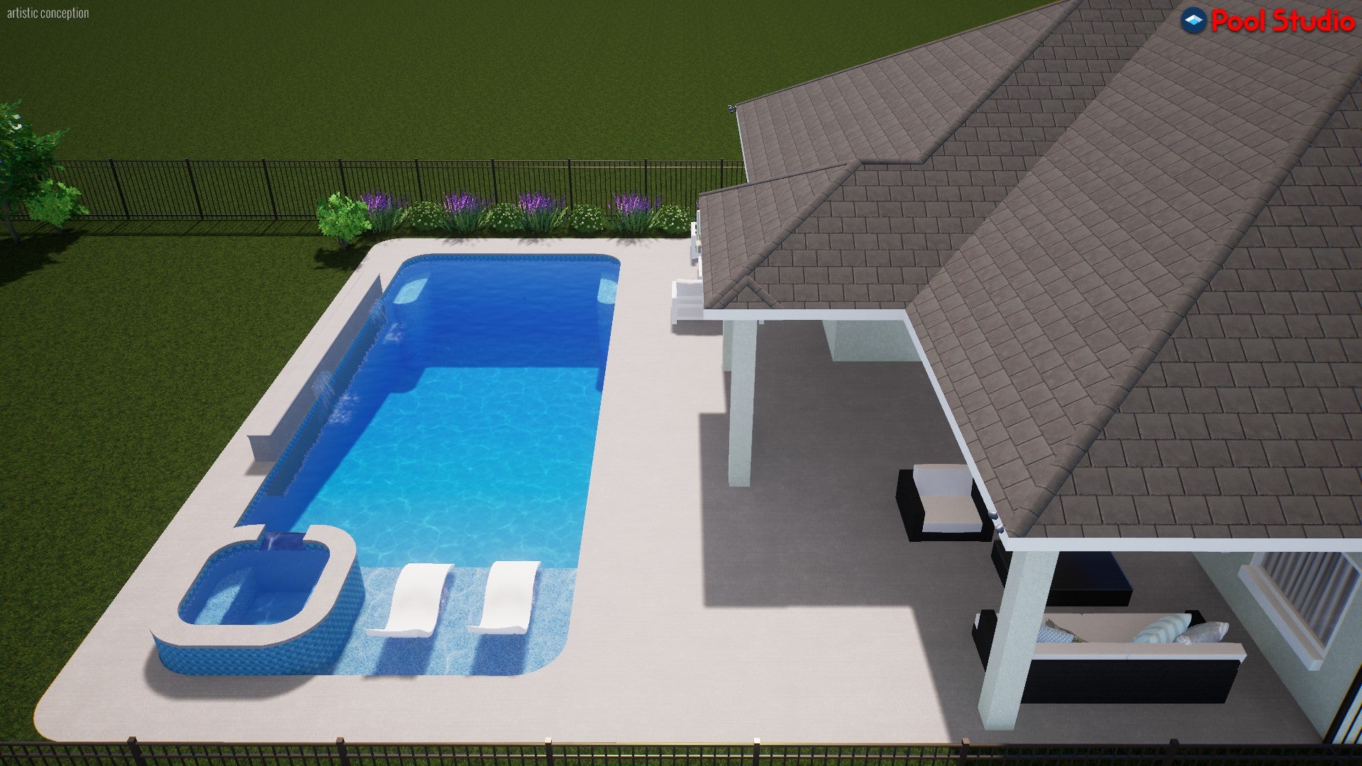 I created this custom 3D pool rendering for a pool builder based on the specifications provided, survey, setback and access taken into consideration. The client wanted to include a bench seat and sun shelf and spillover spa.