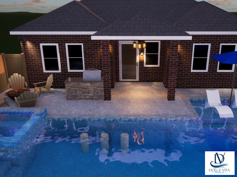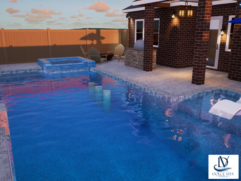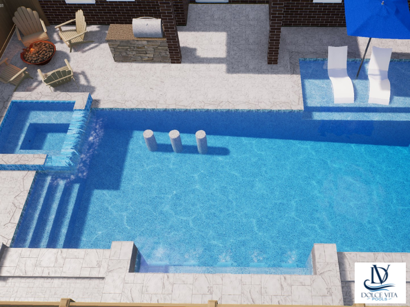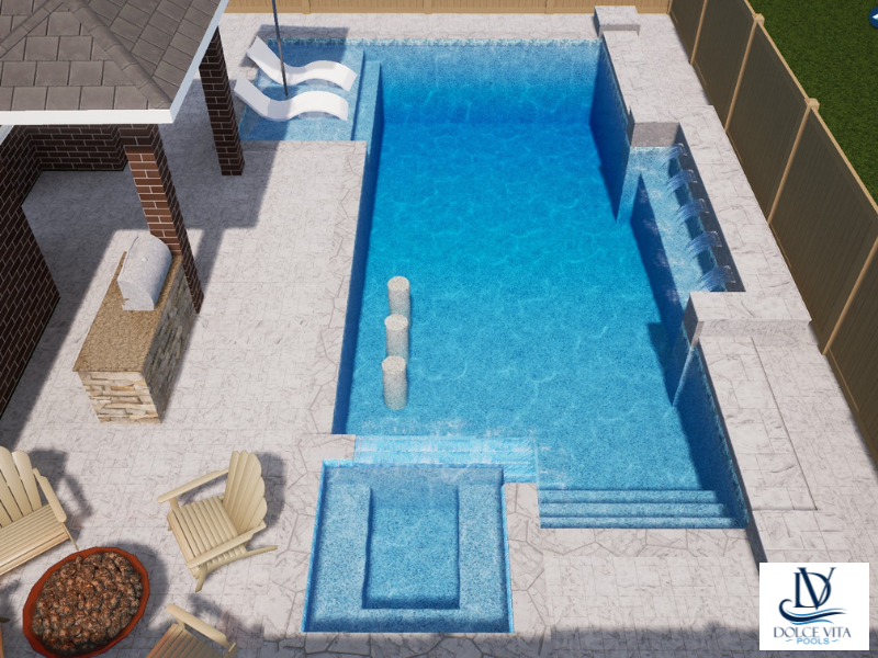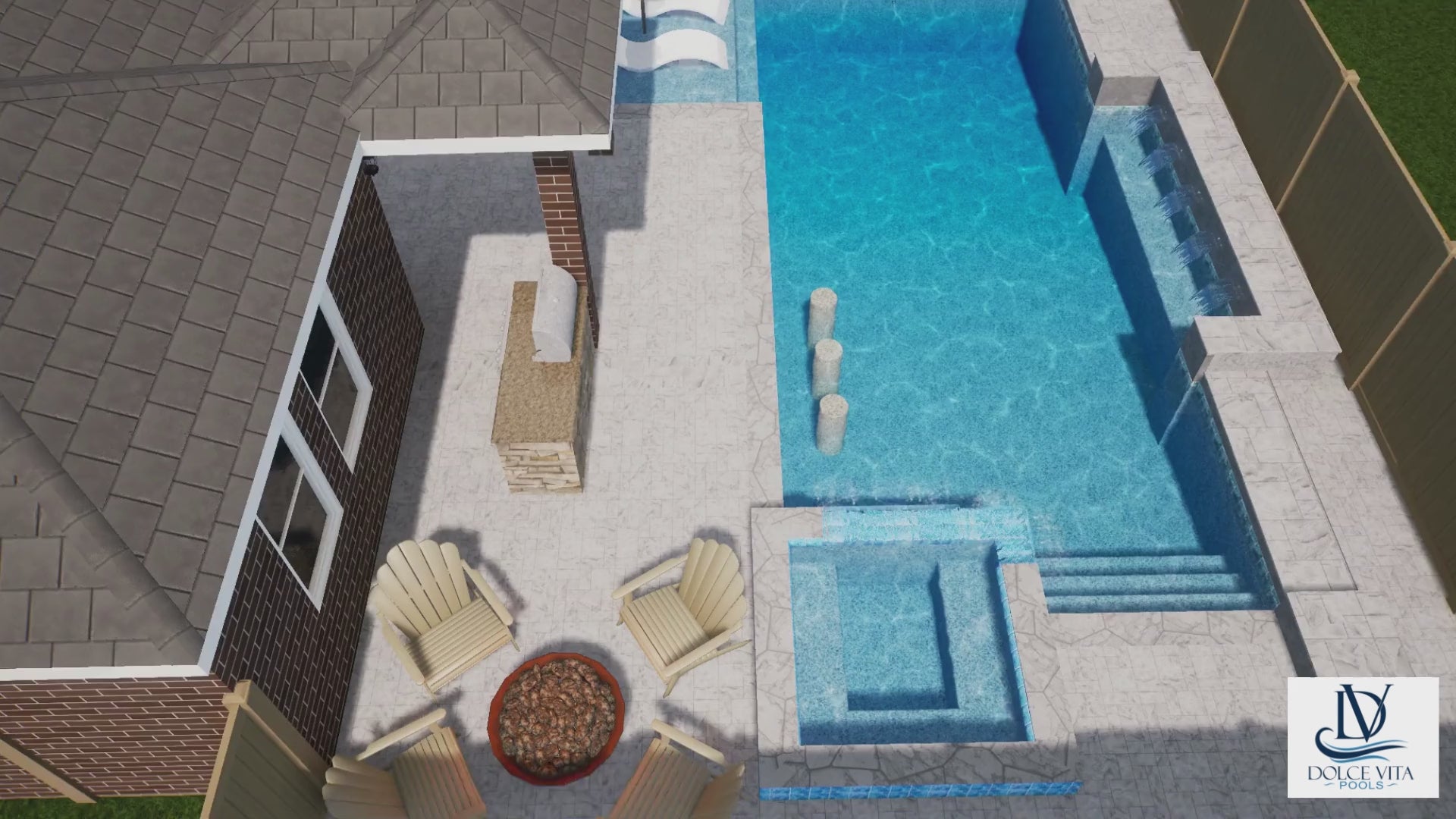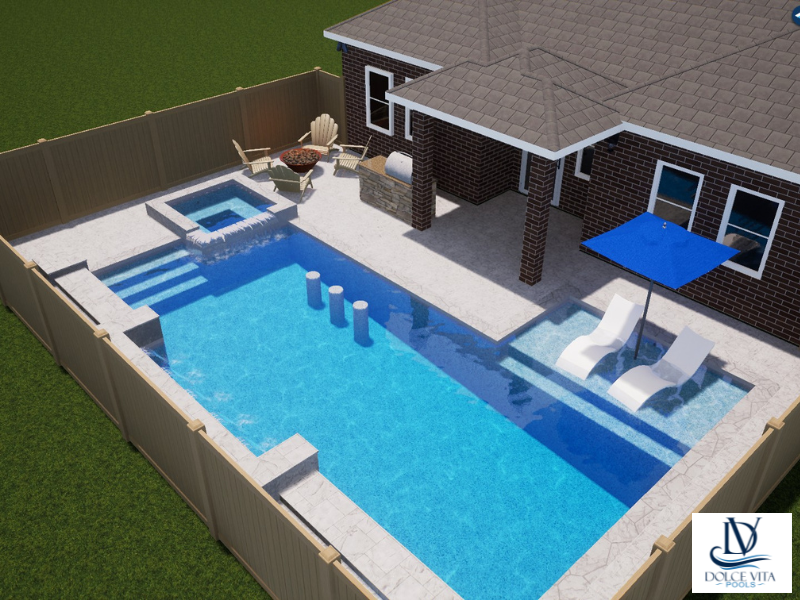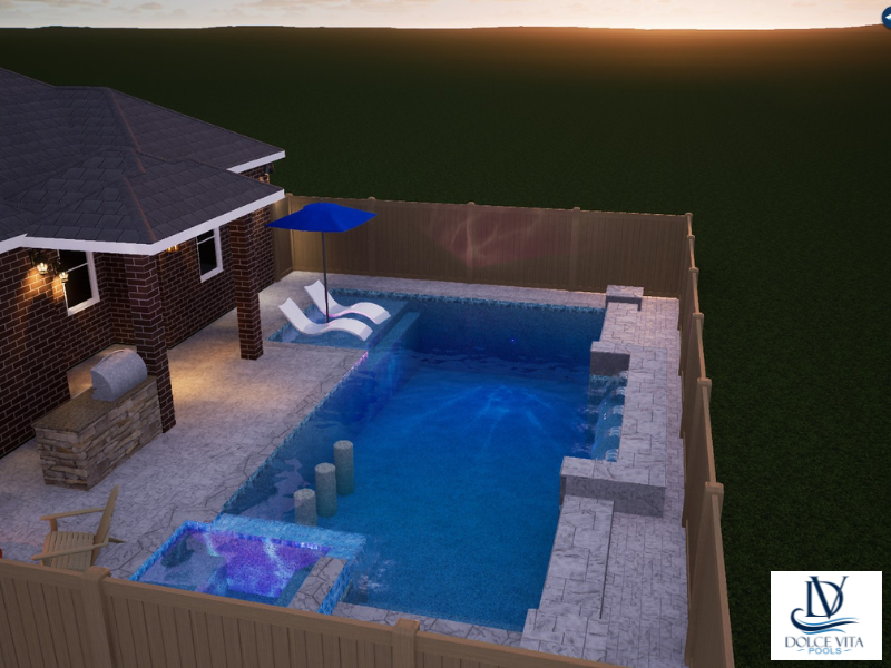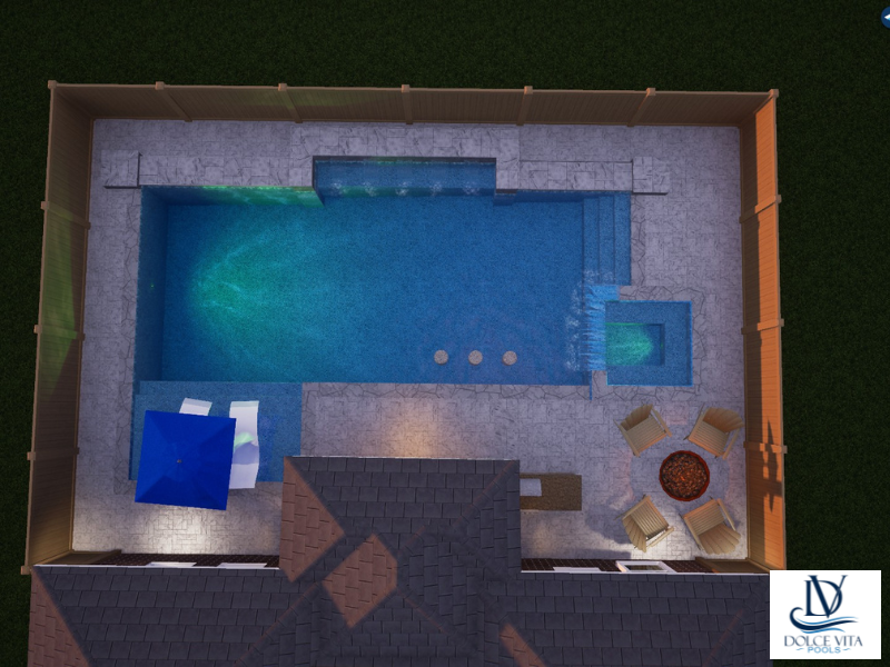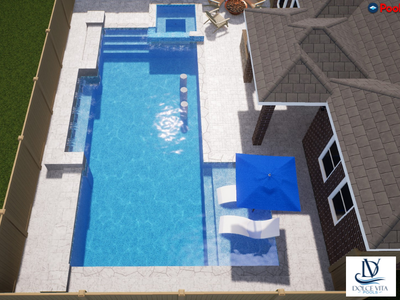 I created this custom 3D pool rendering for a pool builder based on the specifications provided, survey, setback and access taken into consideration. The client wanted to include a bench seat and sun shelf and spillover spa.
