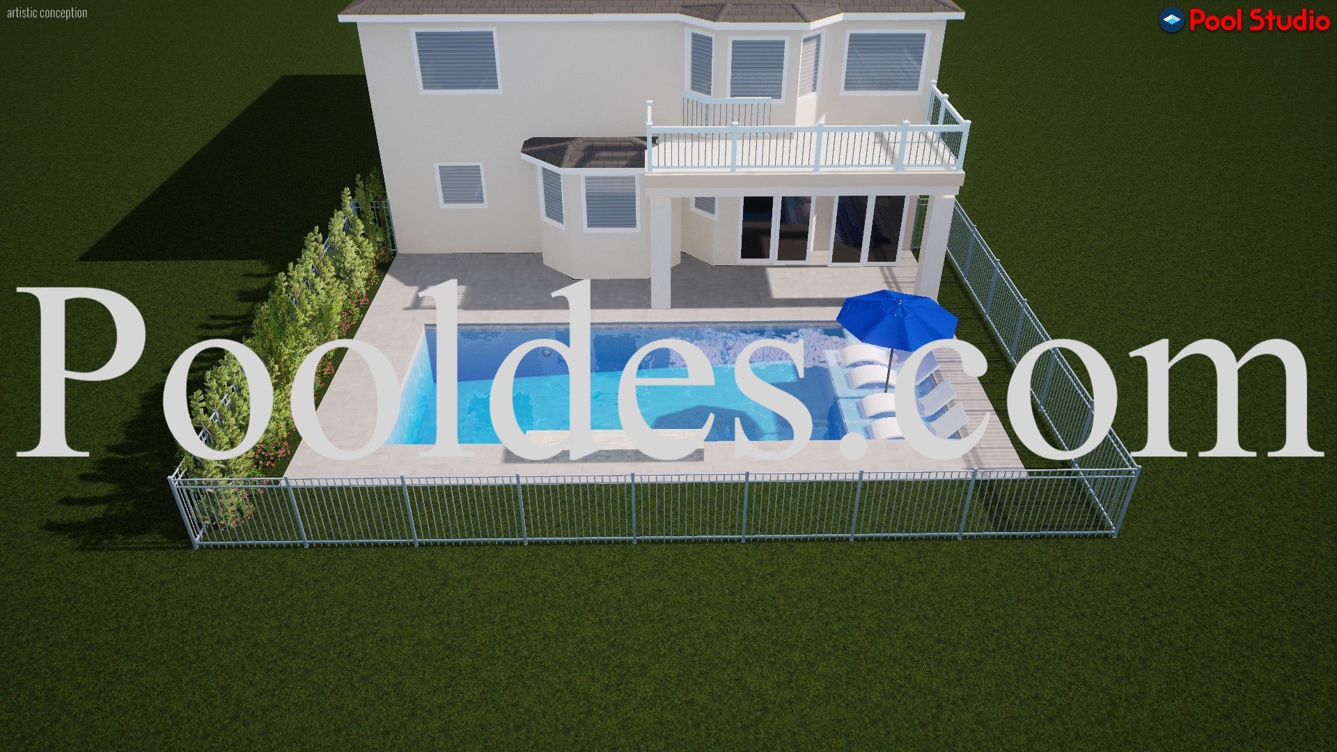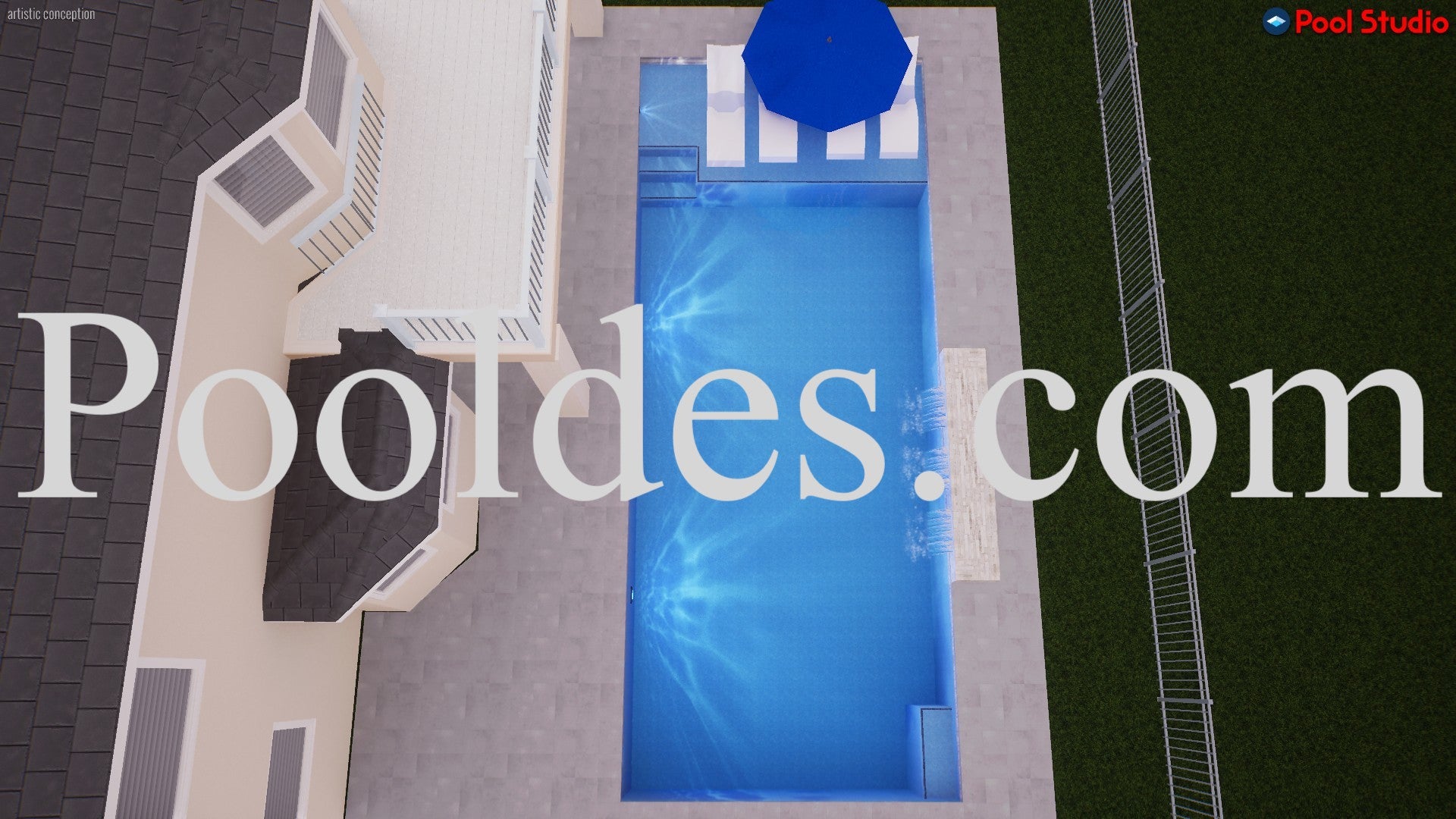 I created this custom pool rendering for a builder based on the specifications provided, survey, setback and access taken into consideration. The client wanted to include a large decking area, 3 arc waterfall feature, a large sun shelf and a blue plaster finish.