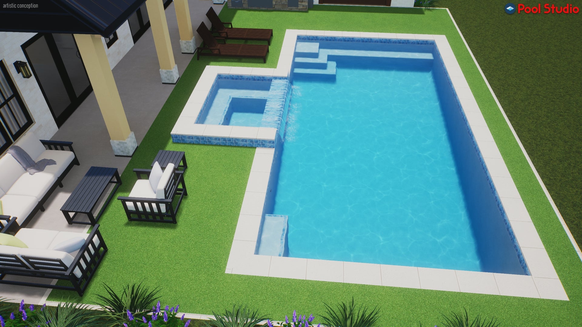 I created this custom 3D pool rendering for a pool builder based on the specifications provided, survey, setback and access taken into consideration. The client wanted to include a bench seat and sun shelf and spillover spa.
